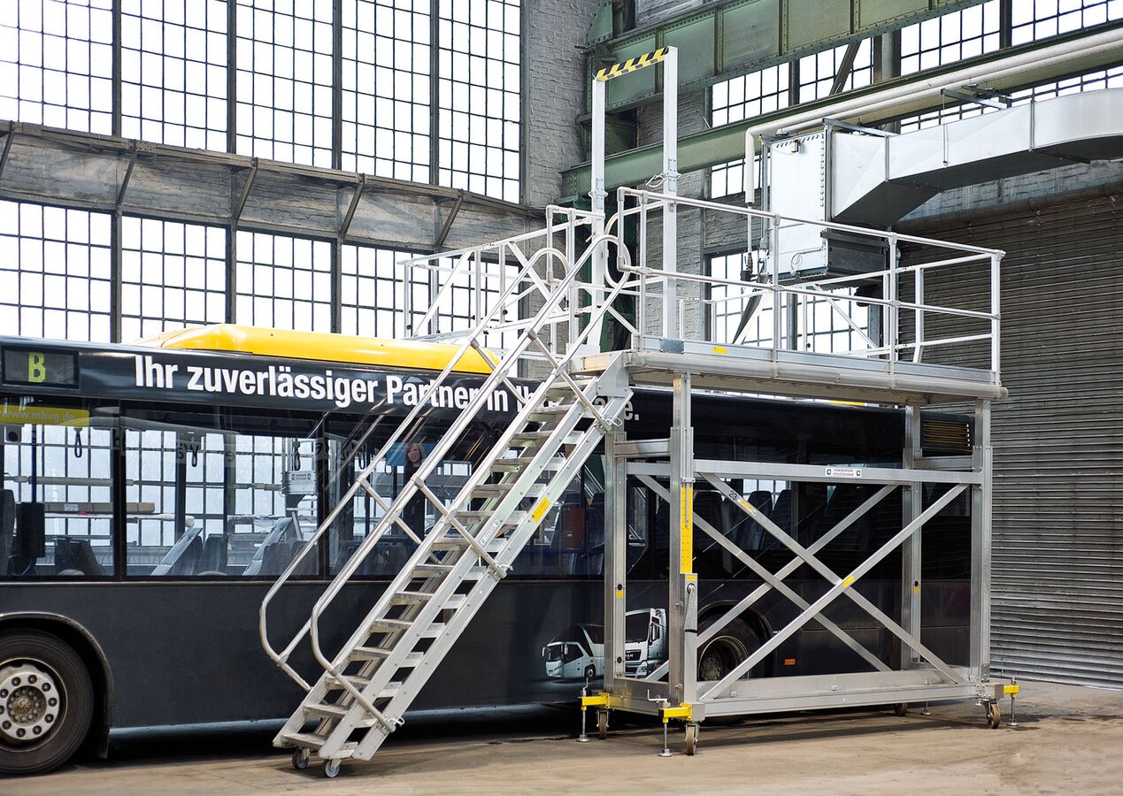 Die Munk Günzburger Steigtechnik bietet standardisierte Basislösungen für Busse und Nutzfahrzeuge sowie individuelle Sonderlösungen an. Mit seinen Aufdacharbeitsanlagen, elektrisch verstellbaren Wartungsbühnen, Laufsteganlagen, Treppenpodesten, Überstiegen und Überbrückungen steigert der Qualitätshersteller aus Bayern nicht nur die Effizienz in den Werkstätten, sondern erhöht gleichzeitig auch die Arbeitssicherheit für das Wartungspersonal.