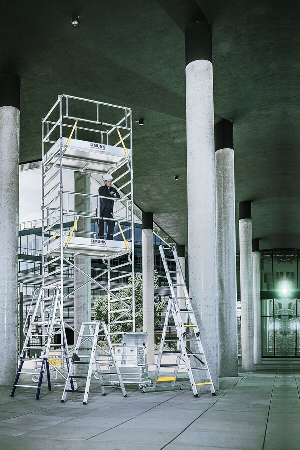 The Munk Group set the pace again in 2023, not only with special designs, but also with product innovations in the industry's most comprehensive series range (over 2,500 products): Innovations such as the first stepladder made in Germany from glass fibre reinforced plastic profiles (GRP), the new version of the FlexxTower single-person scaffolding with advanced guardrail and the SafeCaddy mobile safety system from Munk Rettungstechnik were a complete success.